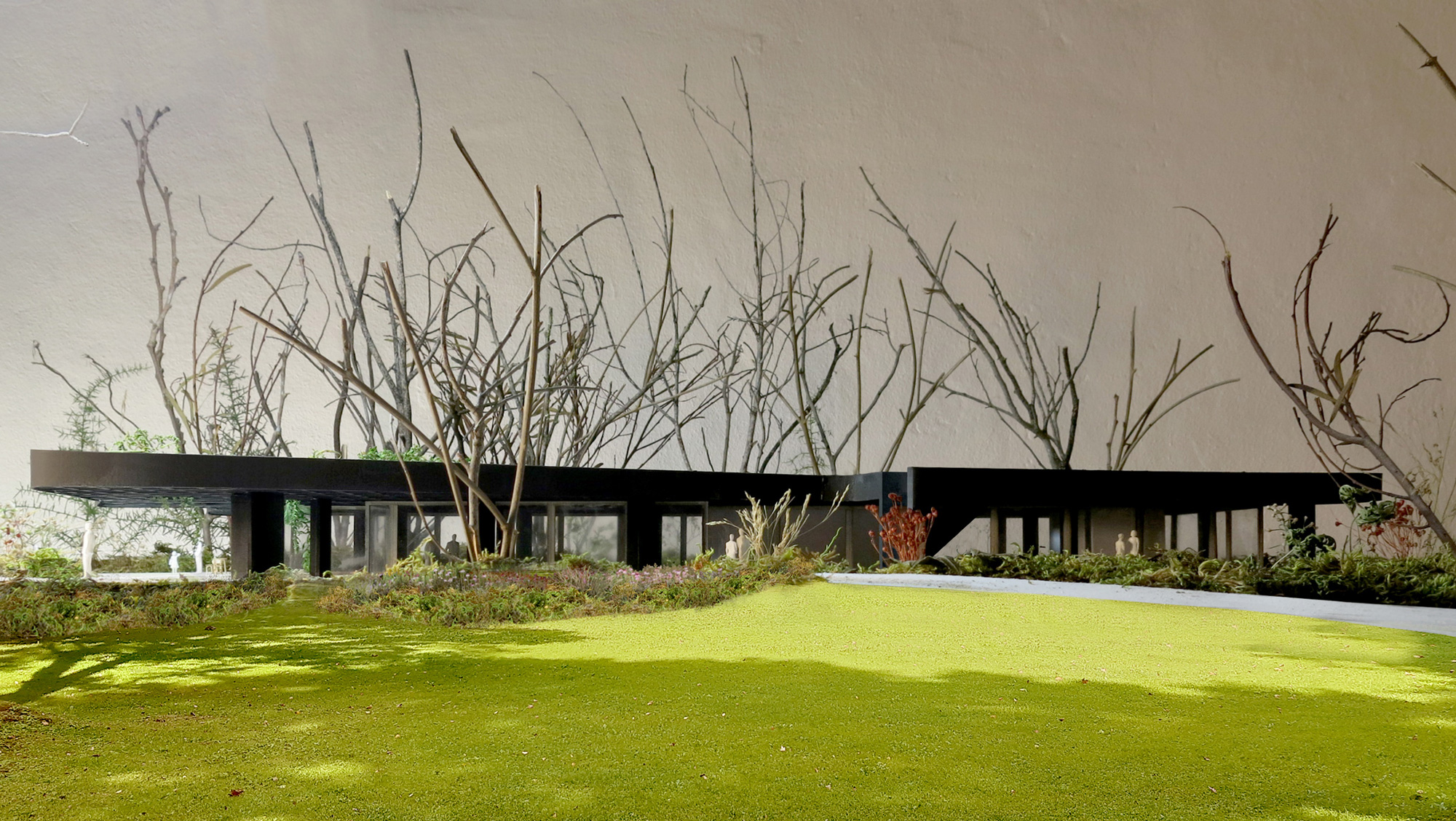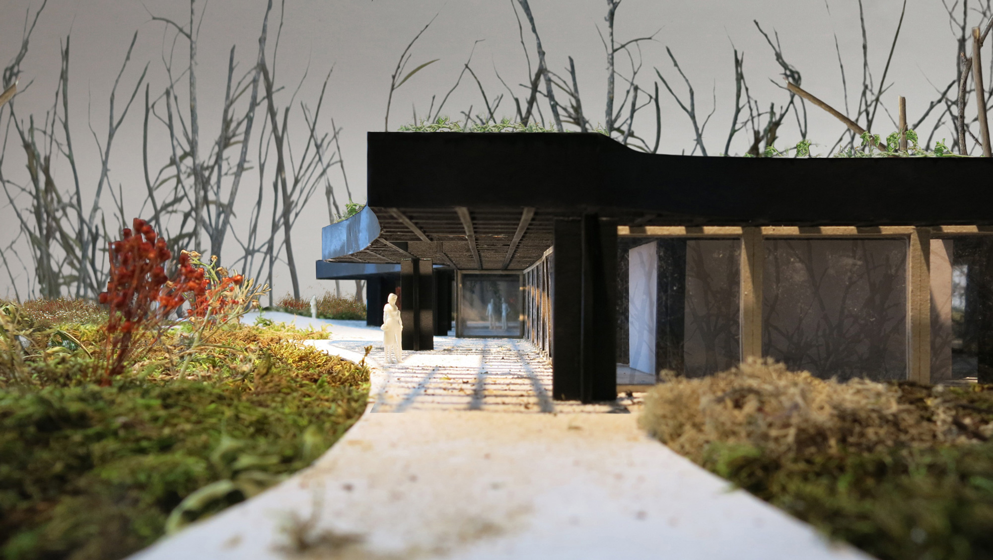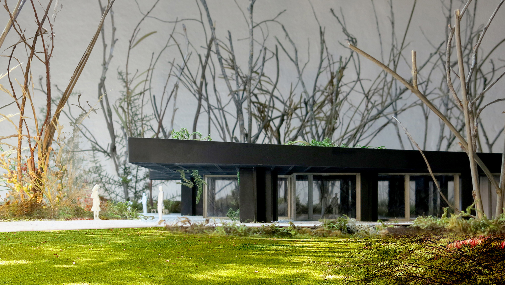 Wege und Pflanzen (Bäume, Büsche, Gräser, Hängepflanzen etc.) führen unter und um das Dach des „neuen Kaffeehauses“ herum. Die Bereiche Außen - Innen sowie Naturraum - Gebäude verschmelzen, die üblichen Grenzen (Schwellen) verschwimmen.