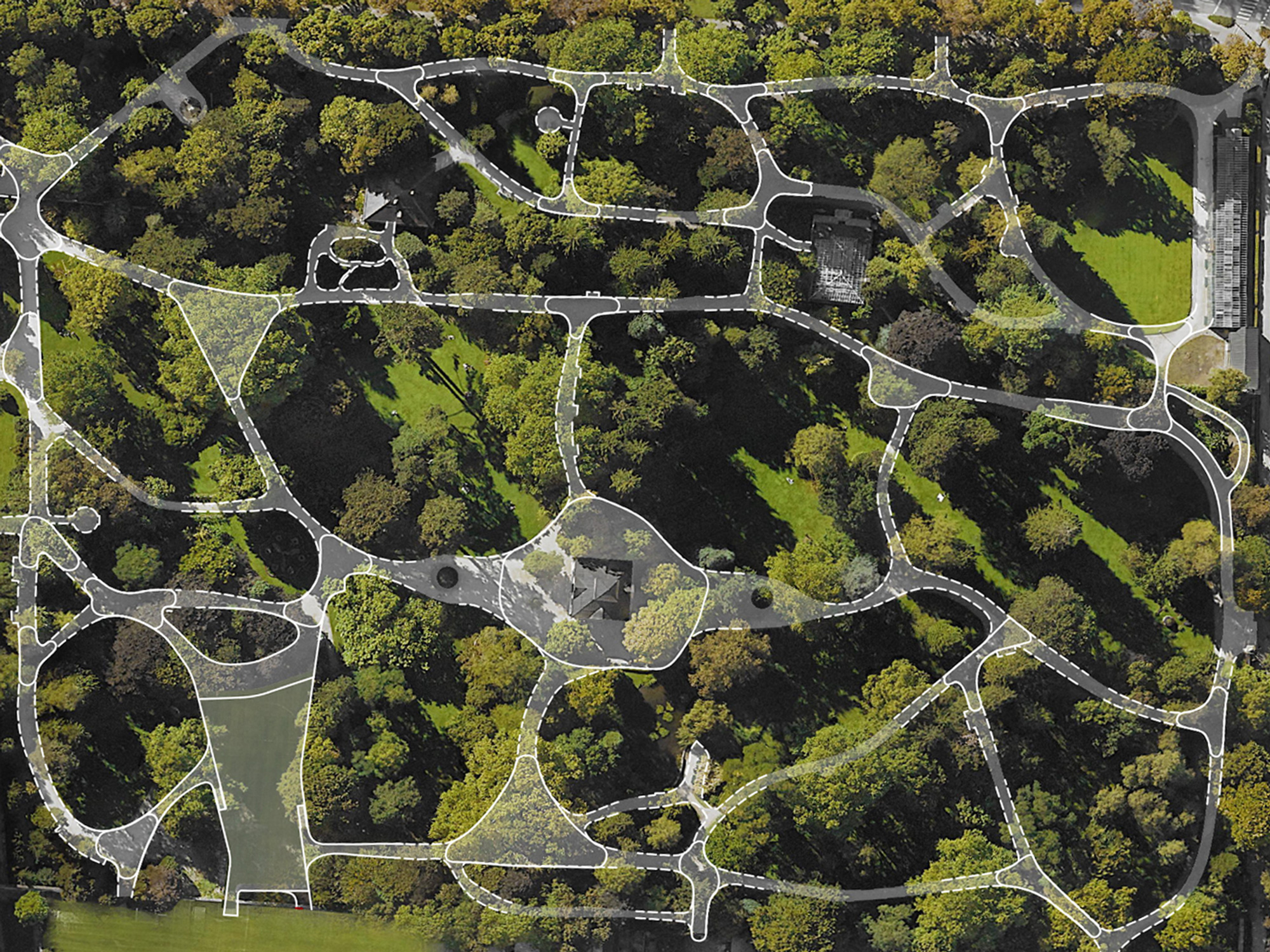 So tritt das neue Gebäude als leicht organisches (bestehendes Wegenetz), horizontales offenes Dach städtebaulich in Erscheinung. Ein rationaler von der Dachkante zurückversetzter Bereich, welcher sich an dem Wurzelwerk der benachbarten Bäume orientiert, bildet den konditionierten inneren Teil des Gebäudes (Gastraum, Bar, Küche etc.).
