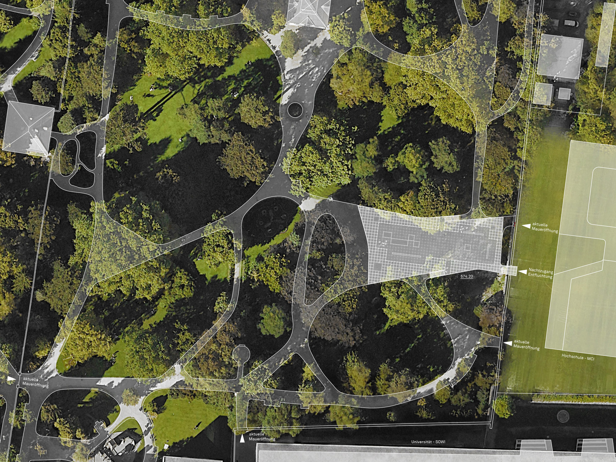 Im Osten führt ein Teil des Daches präzise durch die bestehende, denkmalgeschützte Maueröffnung (Eingang Ost) und bildet somit eine Klammer Zukünftige Hochschule (MCI) Kaffeehaus und Hofgarten.